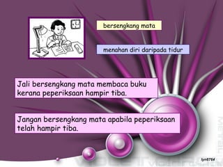 Bahasa Melayu Tulisan Jawi. Perkataan yang manis manis untuk mencairkan hati orang lain. Membawa kertasskrip jawapan peperiksaan sama ada yang belum atau pun yang telah digunakan keluar dari dewanbilik peperiksaan.